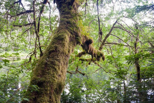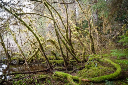 This little lake, just outside of the Walbran watershed on southern Vancouver Island in Ditidaht & Pacheedaht territory, is ringed with beautiful and majestic old-growth temperate rainforest. The massive standing and fallen logs (like the giant Sitka spruce snag), multitudes of dense, towering giants, and sheets of hanging mosses everywhere are so grand here that they resemble the famed forests of the Olympic Peninsula in Washington State.