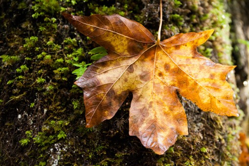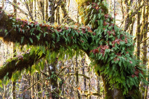 The Mossy Maple Grove is a small grove of enormous old-growth Bigleaf maple trees – some as much as 7 feet (2 meters) in diameter – completely draped in hanging gardens of mosses and ferns. It’s found along a creek just south of Cowichan Lake on Vancouver Island, BC, in the unceded territory of the Cowichan people, who are a part of the Hul’qumi’num First Nations group.