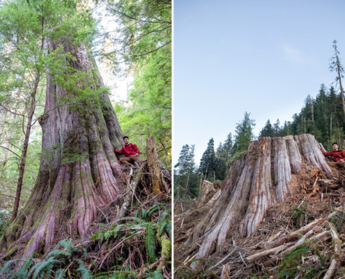 Shocking before-and-after photos reveal destruction of irreplaceable ancient redcedars in Vancouver Island’s Caycuse watershed and highlight urgent need for immediate protection of at-risk old-growth and funding to support First Nations’ protected areas and economies.