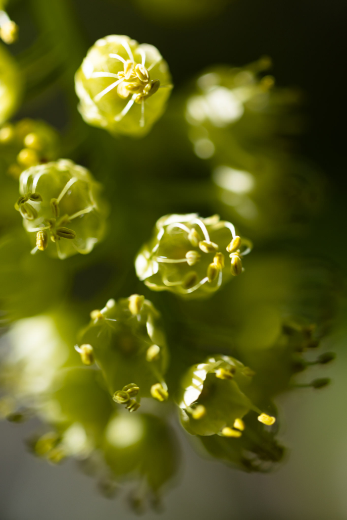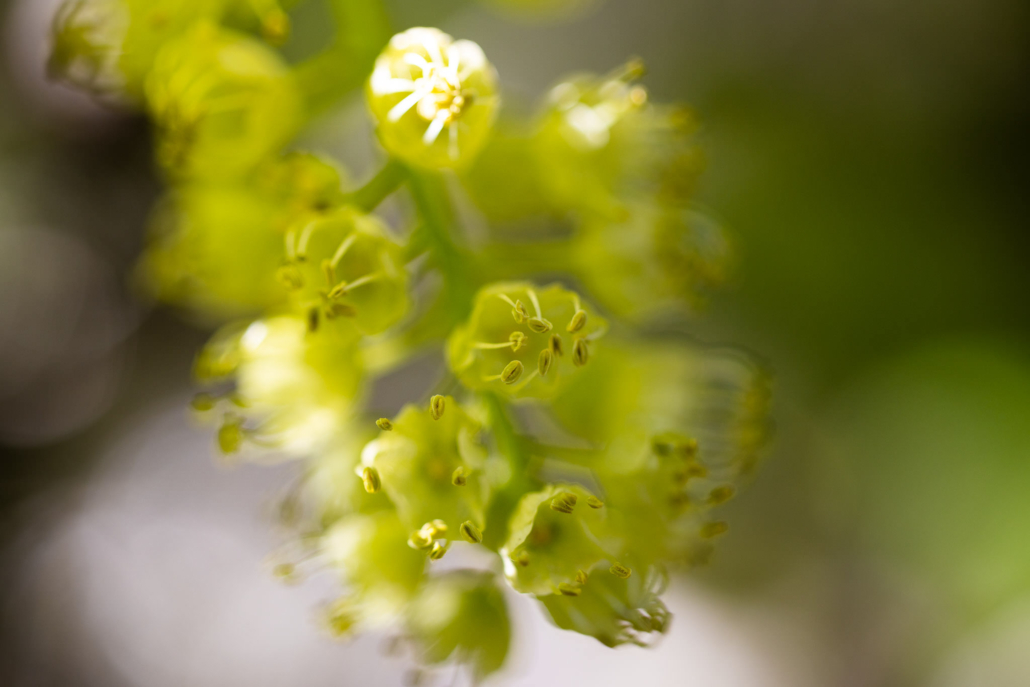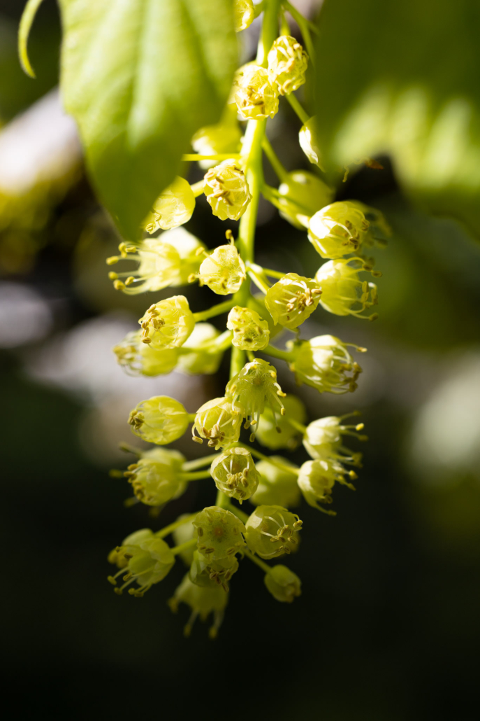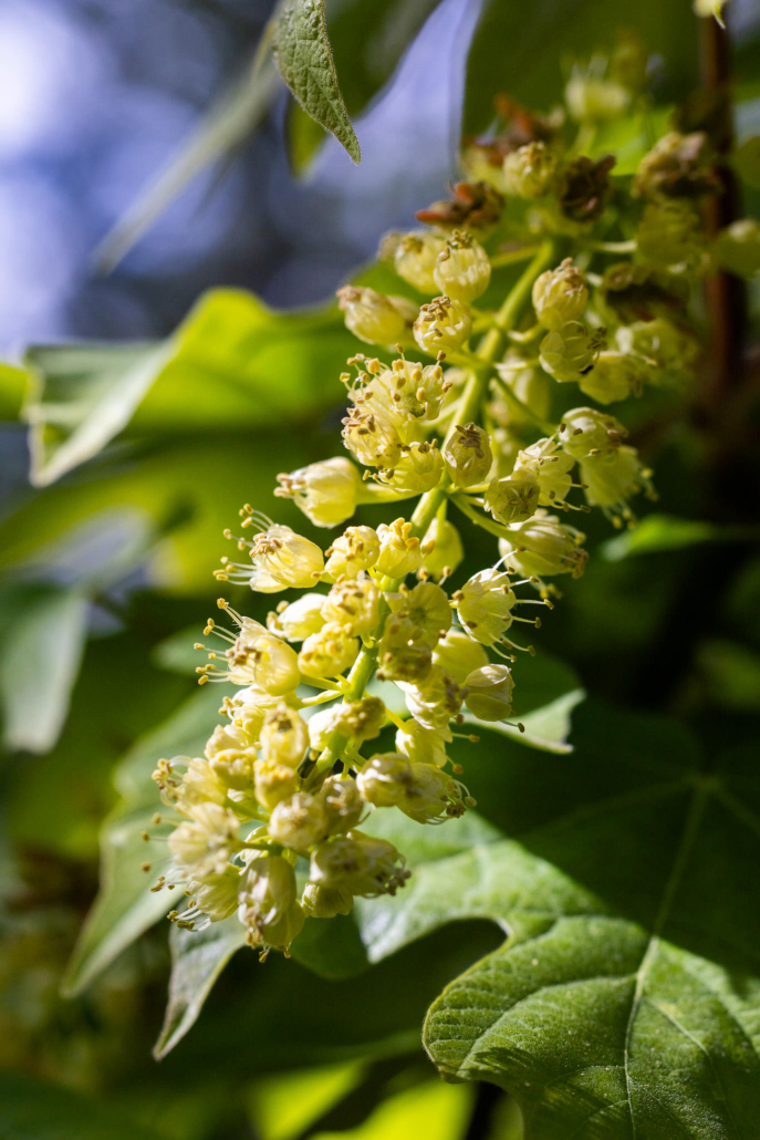 An early sign of spring in the coastal rainforest is a spectacular explosion of flowers, not on the forest floor but in the branches of bigleaf maples! These flowers hang in clusters, and their yellow-green colour may give the casual viewer the impression of emerging leaves. A close examination will reveal that the tree is indeed draped in hundreds of tiny blossoms, a floral show as fecund as a blooming cherry tree, but more subtly blending with the forest palette.