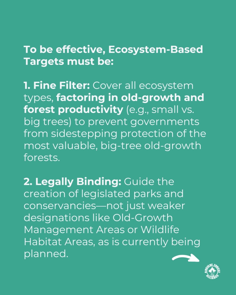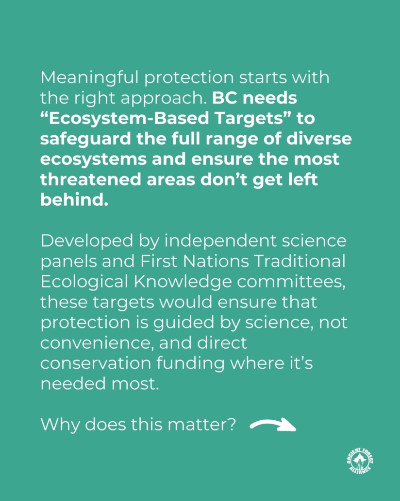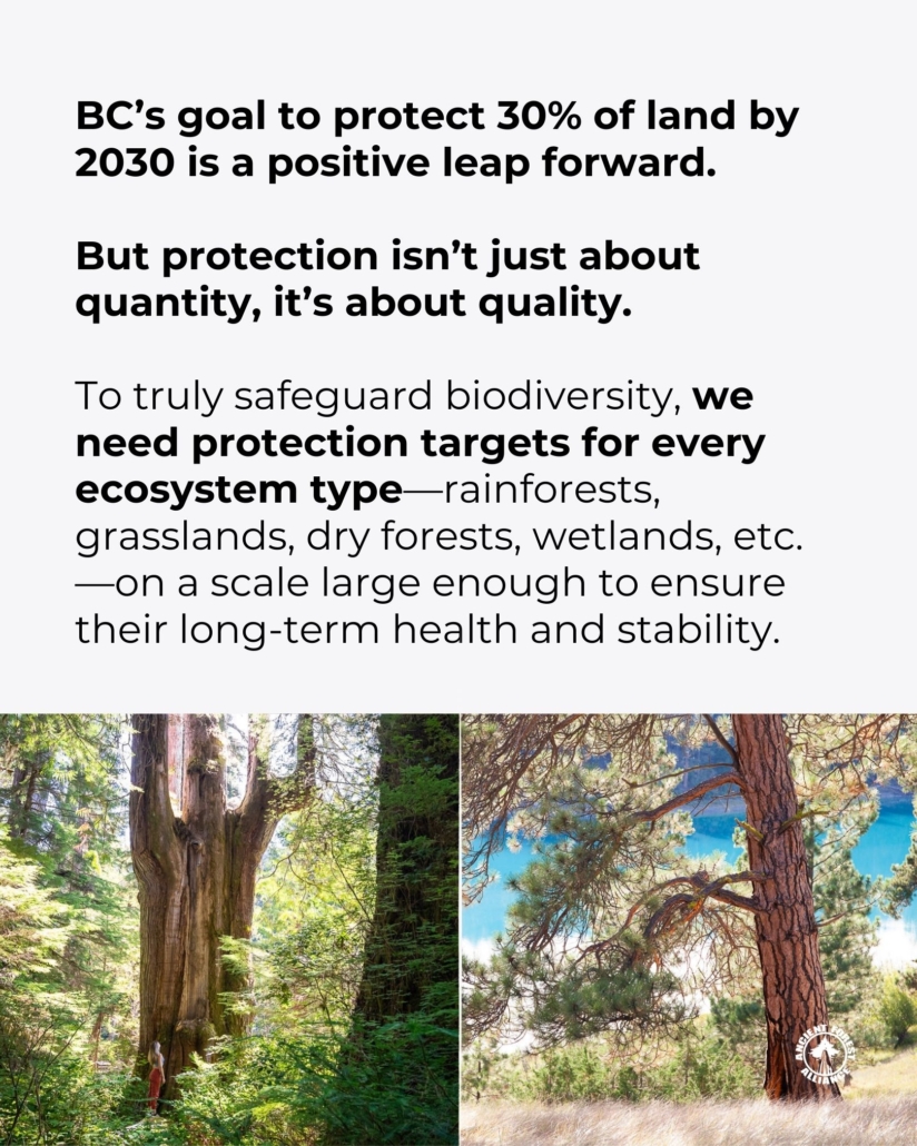 To truly safeguard biodiversity, BC needs “Ecosystem-Based Protection Targets” for every ecosystem type—rainforests, grasslands, dry forests, wetlands, etc.—on a scale large enough to ensure their long-term health and stability.