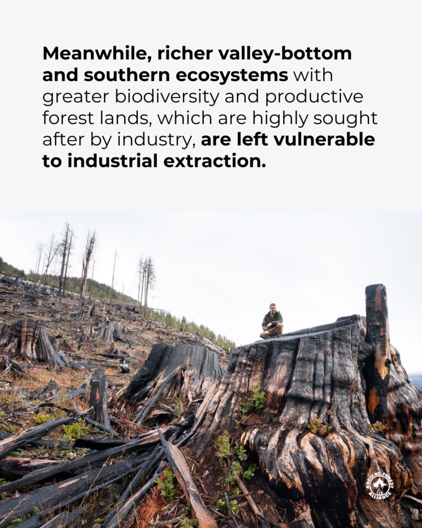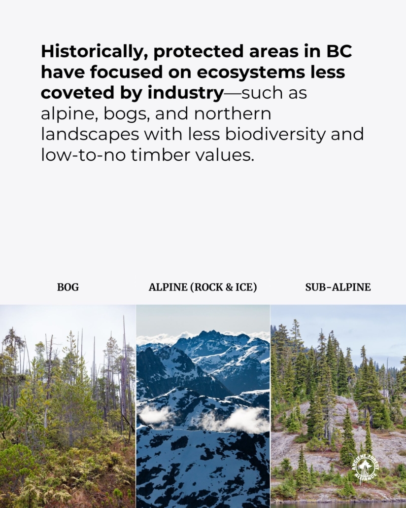Historically, protected areas in BC have focused on ecosystems less coveted by industry. Meanwhile, ecosystems with greater biodiversity and productive forest land, which are highly sought after by industry, are left vulnerable to industrial extraction. It’s been a “save the small trees, log the big trees” approach.