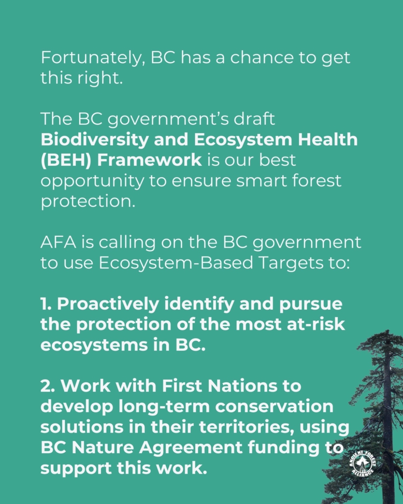 1️⃣ Proactively identify and pursue the protection of most at-risk ecosystems in BC, such as the big-tree old-growth forests.