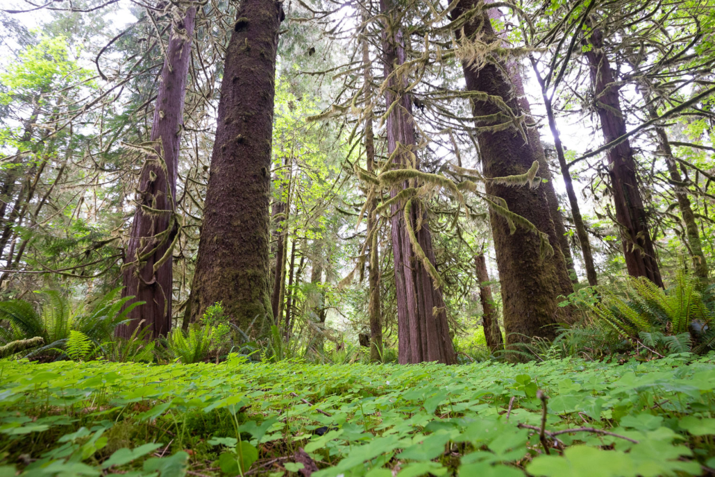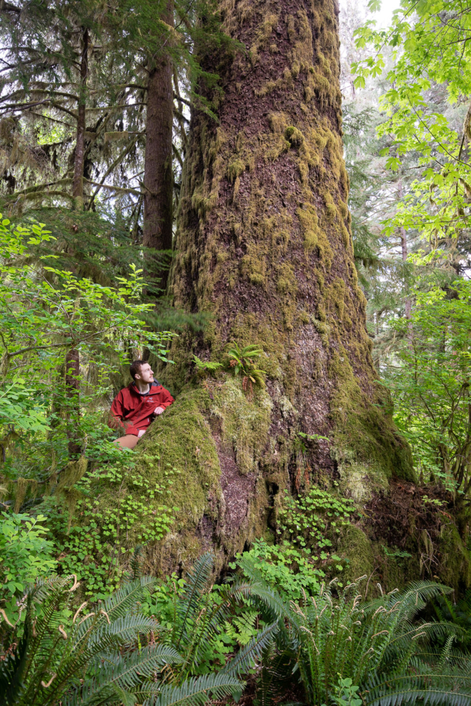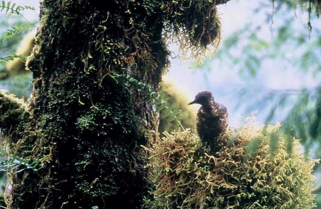 Unlike other seabirds who nest in dense colonies on islands or sea cliffs, the Marbled Murrelet nests deep in the old-growth rainforest, hiding its nest high in the mossy branches of ancient trees like towering Douglas-fir, Sitka spruce, or western redcedar. The tree needs to be big enough, with enormous branches, in order for it to acquire enough epiphytic moss to provide a deep cushion for its egg. Like weathered sailors, Marbled Murrelets spend most of their time at sea, only coming onto land when it’s time to lay their single egg. They can travel a distance of up to 80 km inland from their ocean home, looking for the perfect tree.