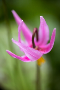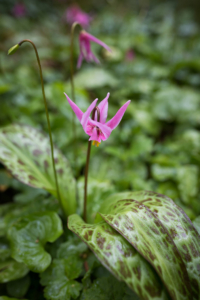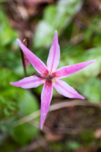The pink fawn lily is a lover of damp forests, especially the rich soils of river floodplains — flourishing in the coastal rainforests of the west coast. First Nations people have traditionally enjoyed eating the bulbs of the pink fawn lily, digging them as the leaves first open in the spring (followed by water to prevent an upset stomach).