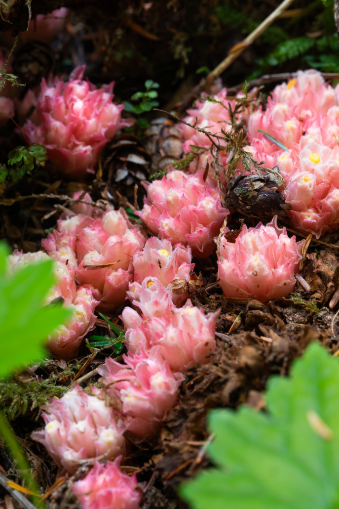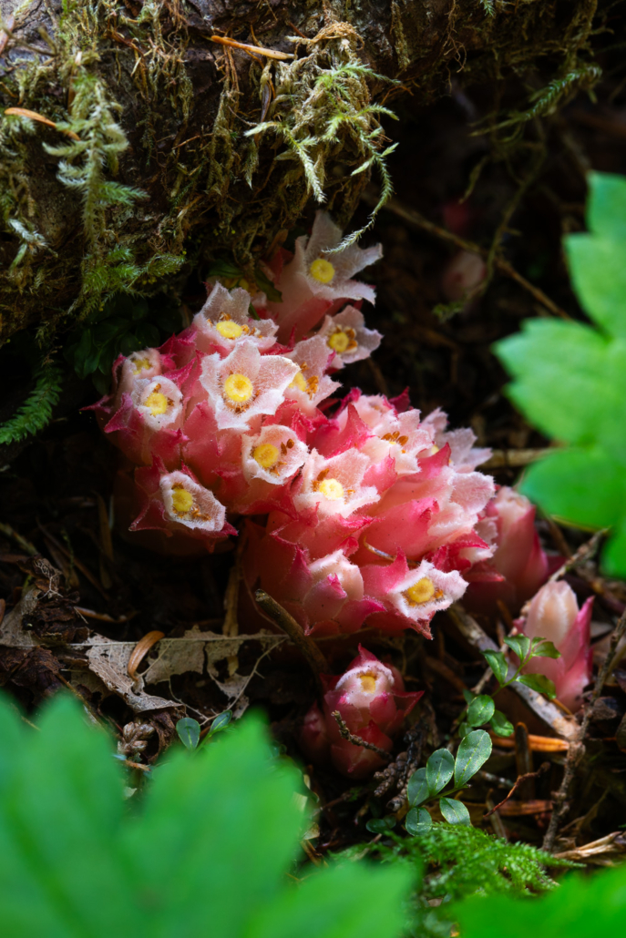 The lack of leaf or any trace of green on the gnome plant reveals that this is a myco-heterotroph: a strange guild of plants that includes the ghost pipe and groundcone that do not photosynthesize like other plants. Rather than spinning its own sugars from sunlight, the gnome plant taps into the complex network of mycorrhizal fungi under the forest floor and steals the solar energy they’ve traded from the trees. A beautiful parasite!