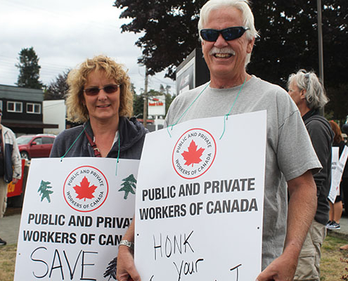 A collaboration of forestry workers and environmentalists took to the streets today in an effort to fight back against provincial raw log exports. Organized by the Public and Private Workers of Canada (PPWC) and the Ancient Forest Alliance, the rally attracted a number of supporters both for the walk up Johnston Road and by honks from those driving by.