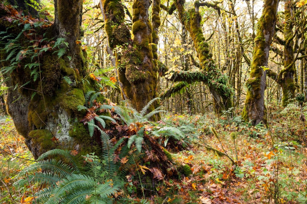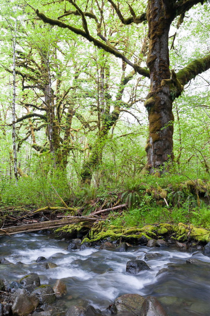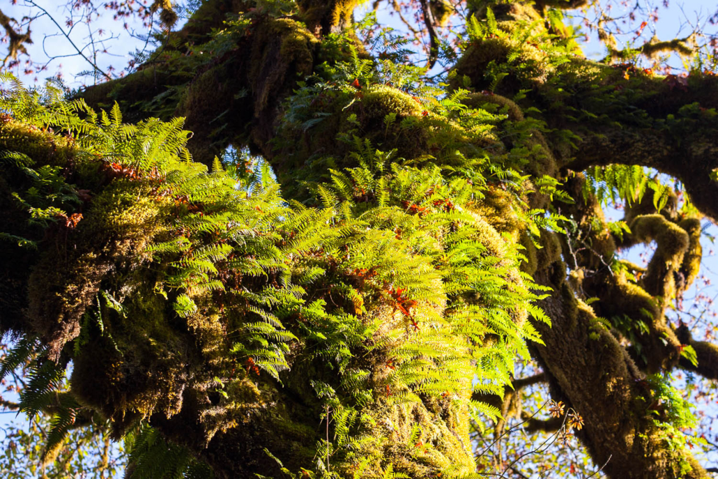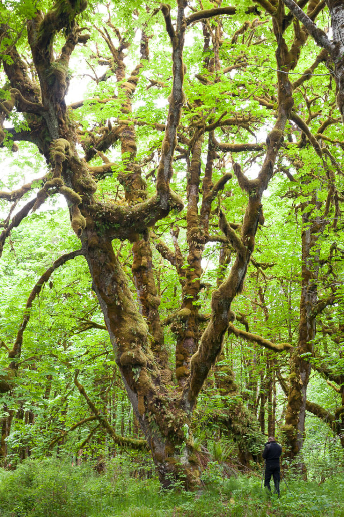 The Mossy Maple Grove is a small grove of enormous old-growth Bigleaf maple trees – some as much as 7 feet (2 meters) in diameter – completely draped in hanging gardens of mosses and ferns. It’s found along a creek just south of Cowichan Lake on Vancouver Island, BC, in the unceded territory of the Cowichan people, who are a part of the Hul’qumi’num First Nations group.