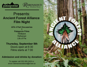 Hosted by Robinson’s Outdoor Store and Patagonia, the evening will feature an original 4 episode docu-series from Robinson’s, three short films from Patagonia, a presentation from AFA’s TJ Watt, and there will even be an Ancient Forest Ale available for your enjoyment!