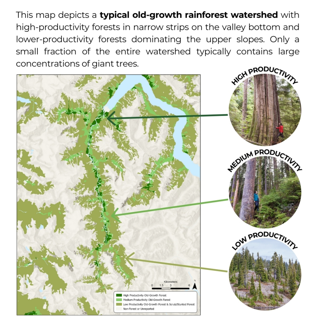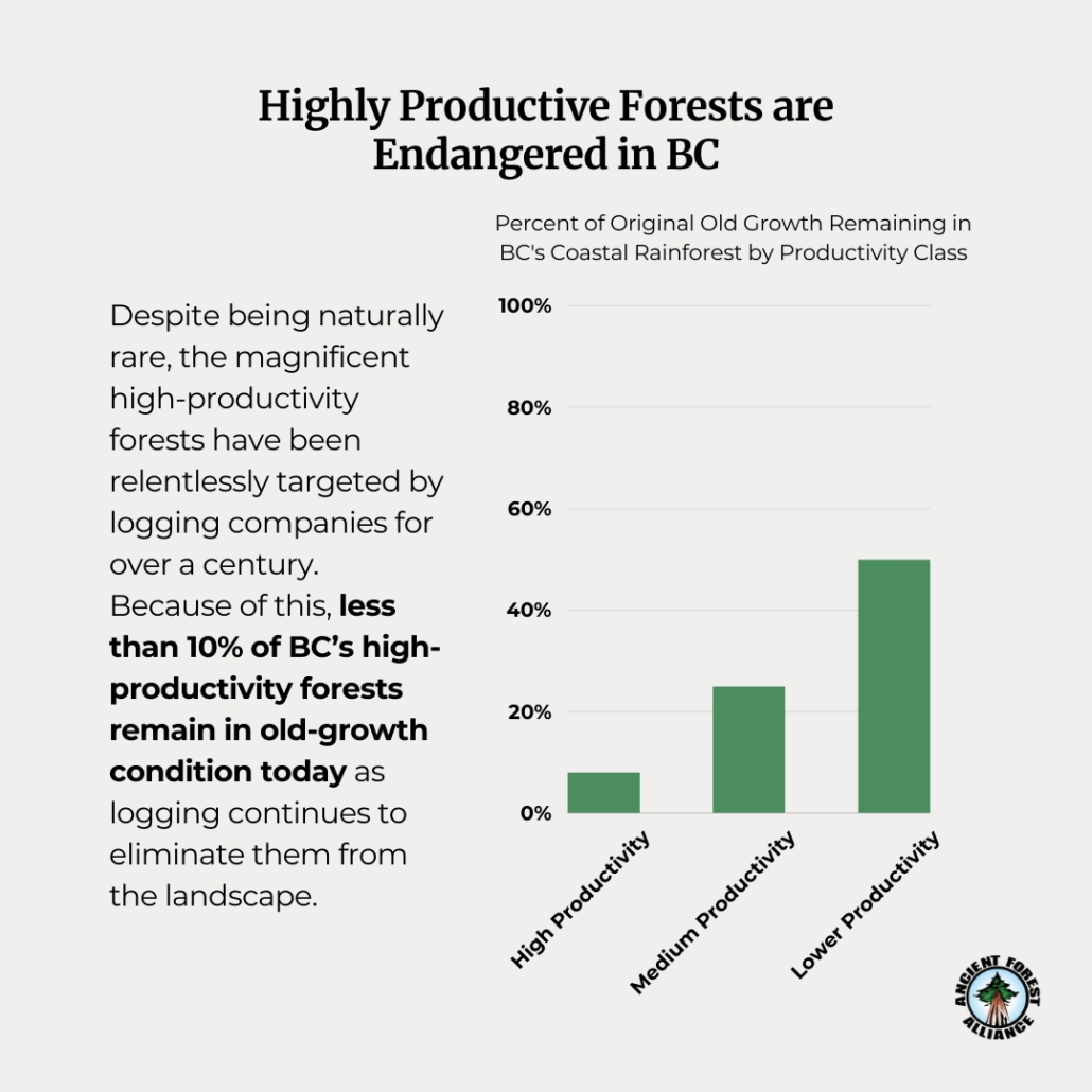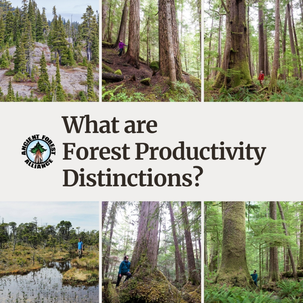 “Forest Productivity” refers to the capacity of the forest to produce large trees, with the endangered, higher productivity forests generally featuring the giant ancient trees that BC is famous for.